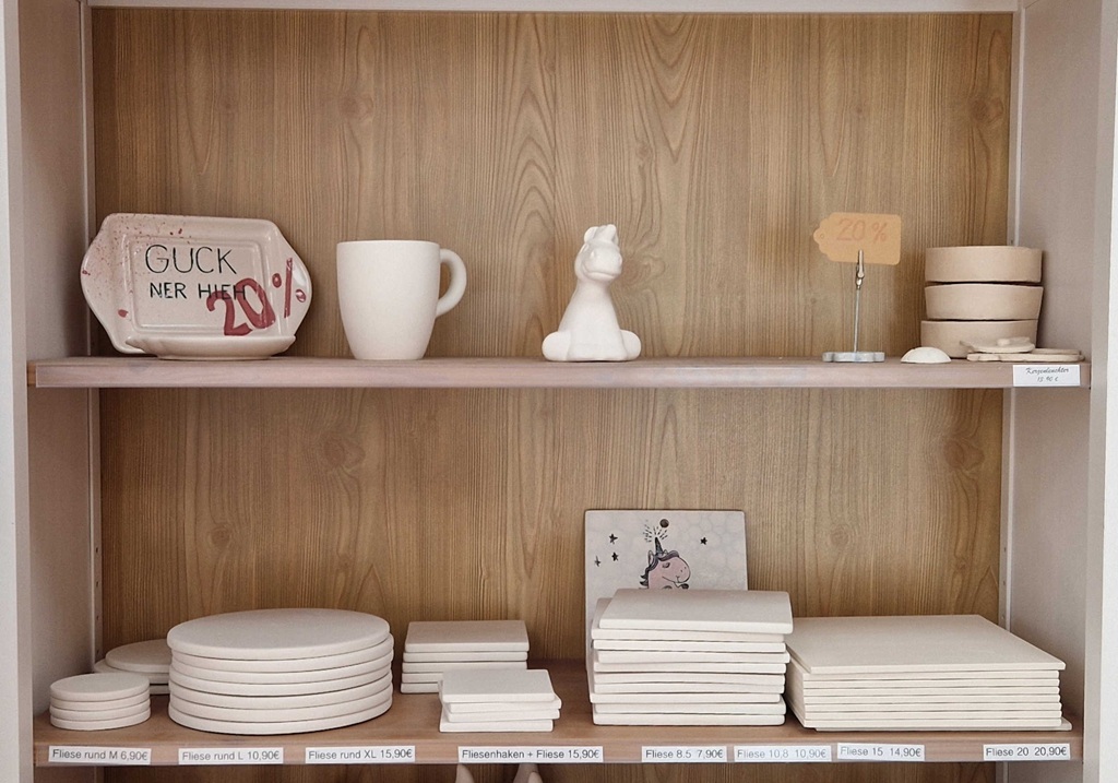 Bei einem Malpaket zahlst du wie sonst auch im Laden regulär den Preis für deinen Rohling, beim Abholen kommt dann lediglich ein Pfand von 20,-€ für die Farbbecher und ggf. Pinsel dazu. Diesen erhältst du entsprechend zurück, wenn du dein Malpaket vollständig und innerhalb der Ausleihfrist wieder abgibst.