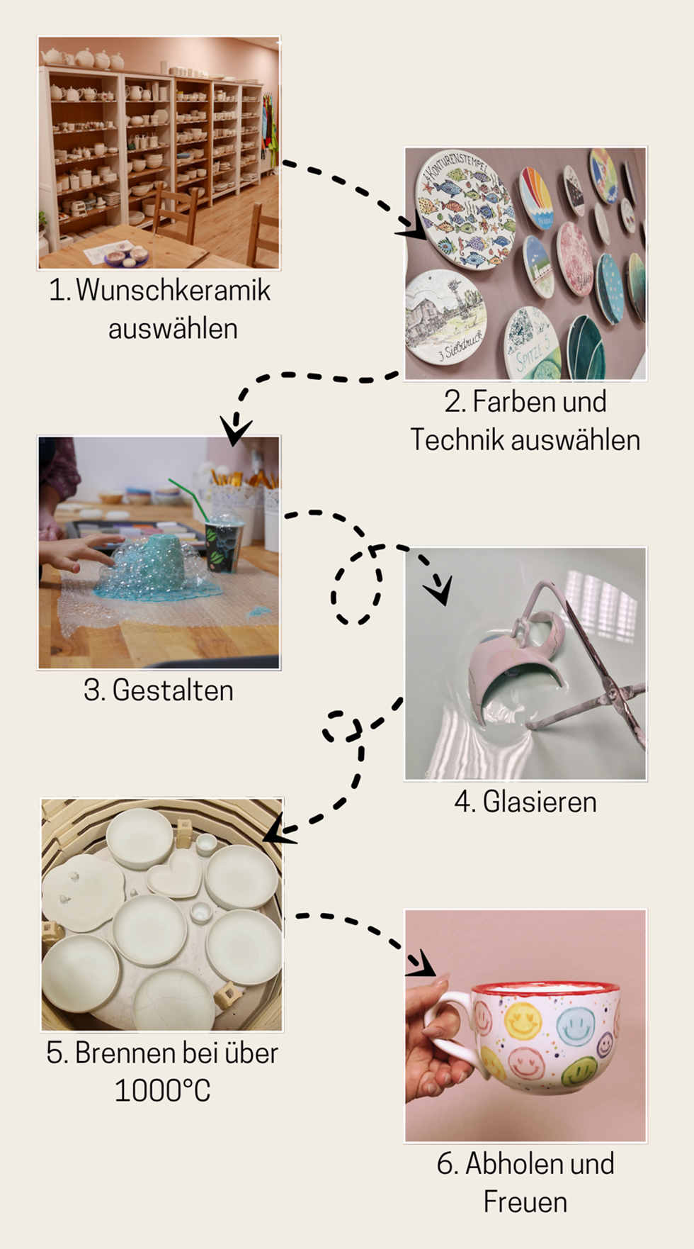 - kurze Brennzeit, nach ca. einer Woche ist deine Keramik fertig zur Abholung